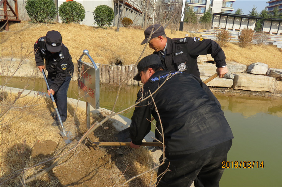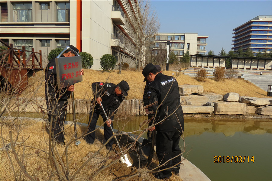 在2017年的安全检查中,安保处提出了制作严禁嬉水、严禁上冰的警示牌,但由于地面上冻严重,只在关键部位想办法设立了一个严禁上冰的牌子。开学后,天气逐渐转暖,3月14日安保处组织保安老师在明日天气反复变冷前,加紧填埋,将所有标识全部安装到位。