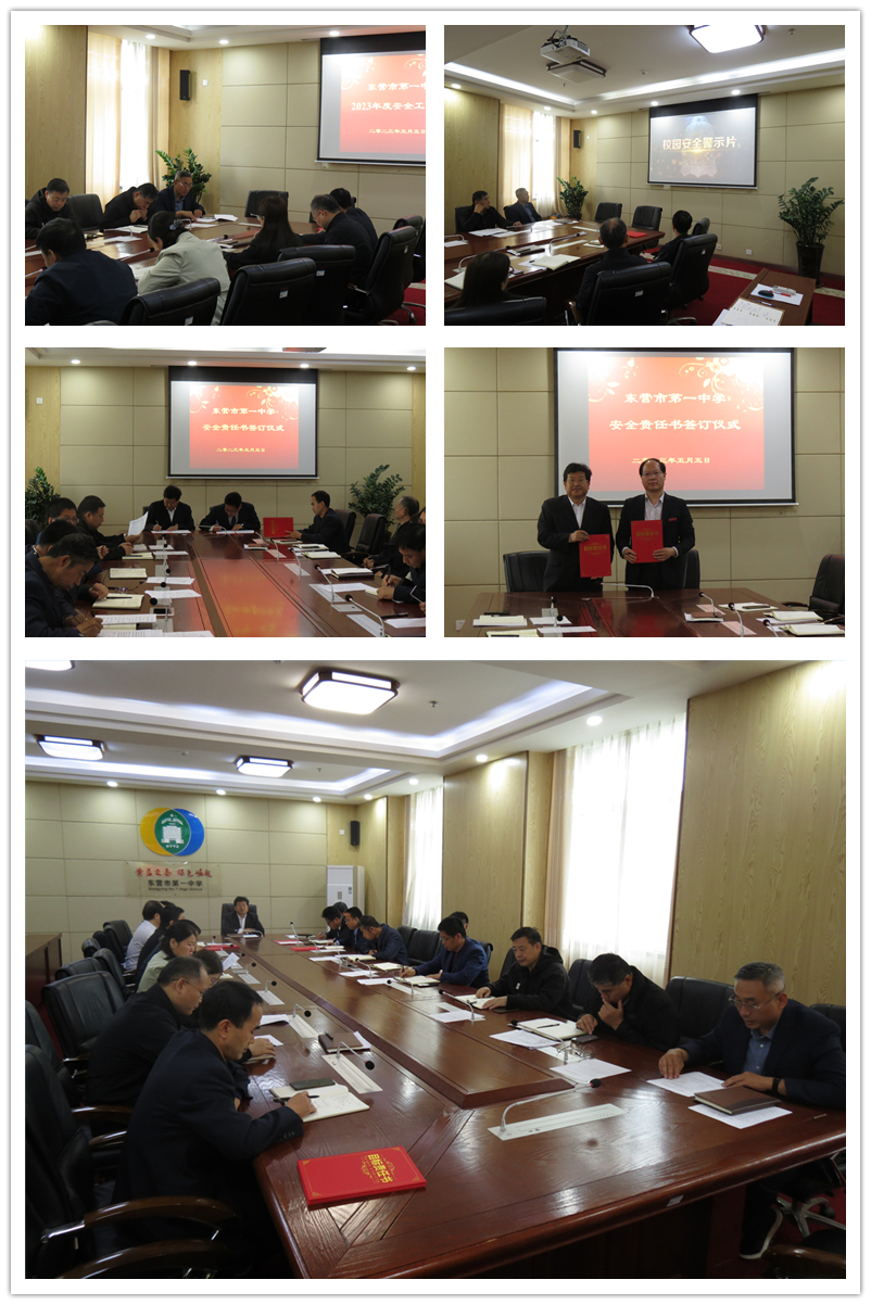 会上首先由安保处主任康述志同志传达了“东营市教育系统安全会议”内容;之后所有参会人员观看安全教育警示片,史校长与教务处、办公室、学管处、总务处、高三级部等科室代表签订安全责任书;最后学校党委书记、校长史本泉同志对2022年校园安全工作进行总结,分析了当前学校安全的严峻形势并对2023年学校安全工作进行部署。