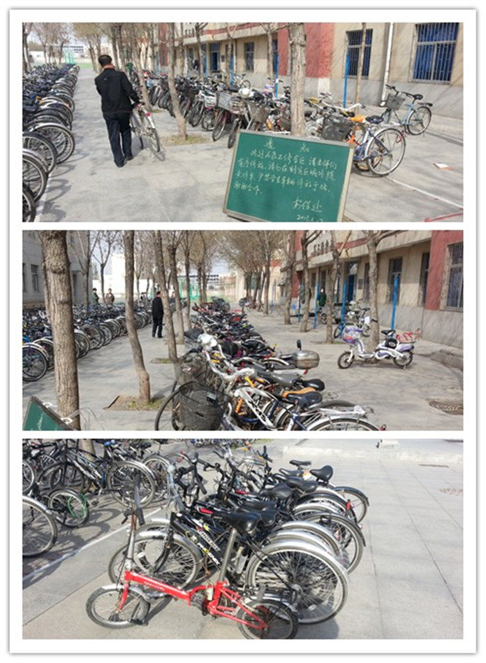 高一自行车停放区域停车秩序一直较好,但也存在一定问题。由于高一停车区和高二女生以及教工停车区毗邻,所以增加了管理难度。有的学生停放自行车时不按照号码,有的学生不锁自行车,有的学生不办理停车卡,还有个别老师在自行车停放时因图省事而把自行车放在划定的区域外面。