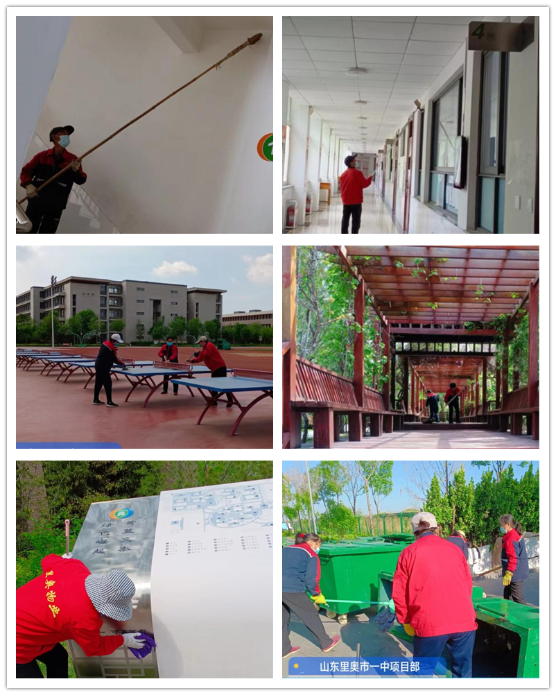 五一长假期间,有10余名保洁人员坚守在工作岗位,用辛勤的劳动扮靓校园,以实际行动诠释“劳动最光荣”。趁学校放假,重点加大对教学楼走廊、公厕、生活垃圾清运、楼梯间除尘等保洁力度,强化对读书连廊、标识牌、乒乓球台等外围保洁工作。在夏季来临之前,彻底清理垃圾桶内残留污垢,做到垃圾桶的内部和外部清洁无污垢无异味。