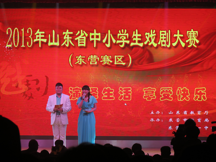 2013年10月29日,山东省中小学生戏剧大赛(东营赛区)在美丽的市一中举行。霜降之后,天气继续转凉,校园里一片片金黄色的叶子随风飘落。