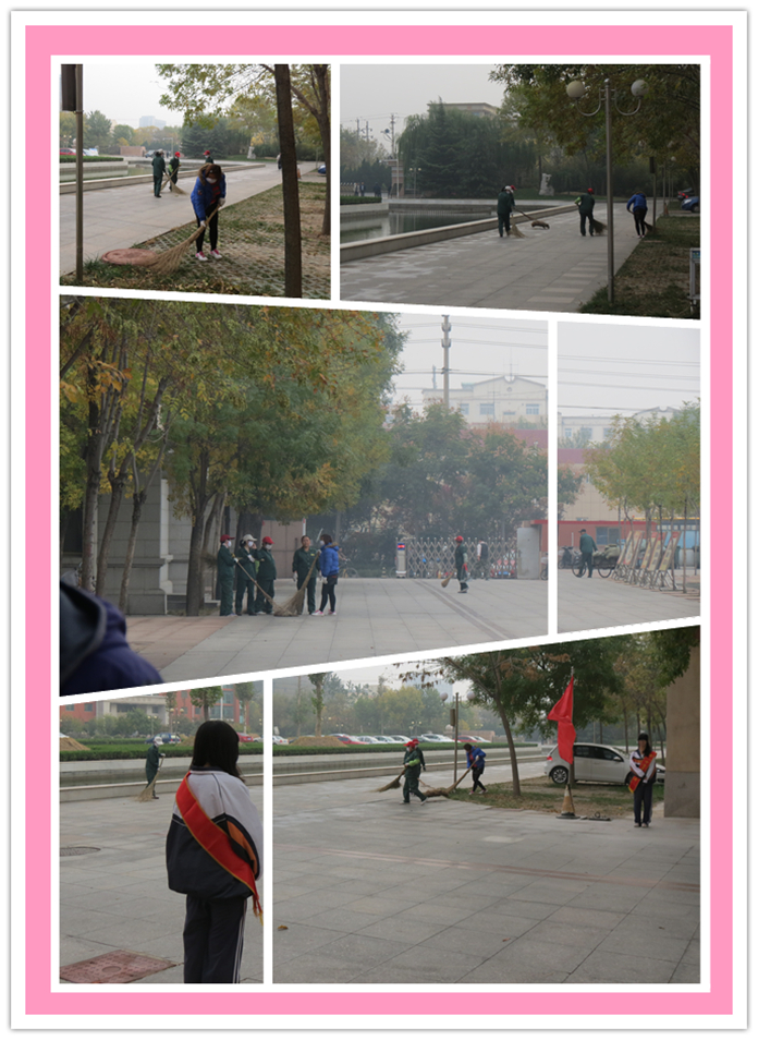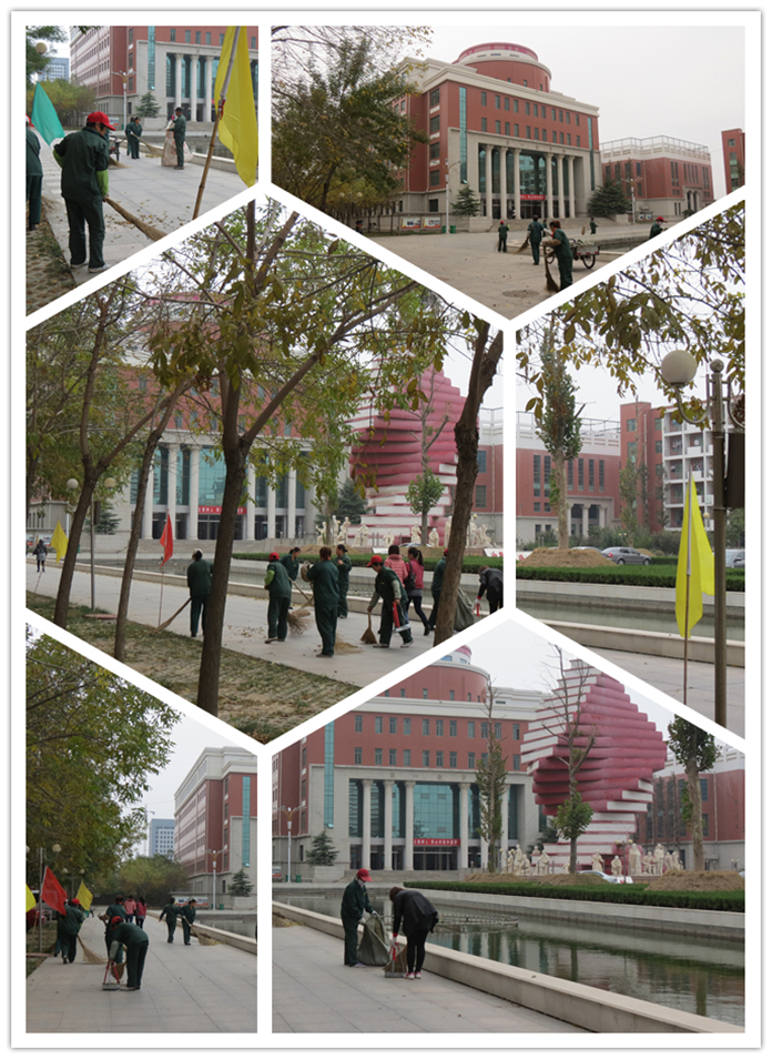由于参赛的各学校定于早上八点钟集合,市一中的保洁老师们六点前便集合了起来,及时清理夜间掉落的树叶。