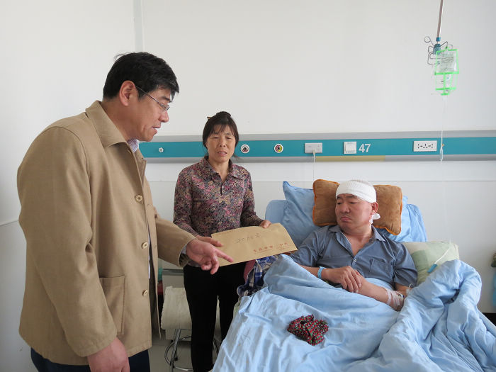 3月8日上午,东营市一中工会副主席赵自平代表学校领导级党委去医院看望生病住院的学校前保安人员郑磊同志,赵主席祝福郑磊同志早日康复,摆脱病痛折磨,并送上礼品及慰问金2000元,郑磊及其家属热泪盈眶,表示了对学校领导的感谢。