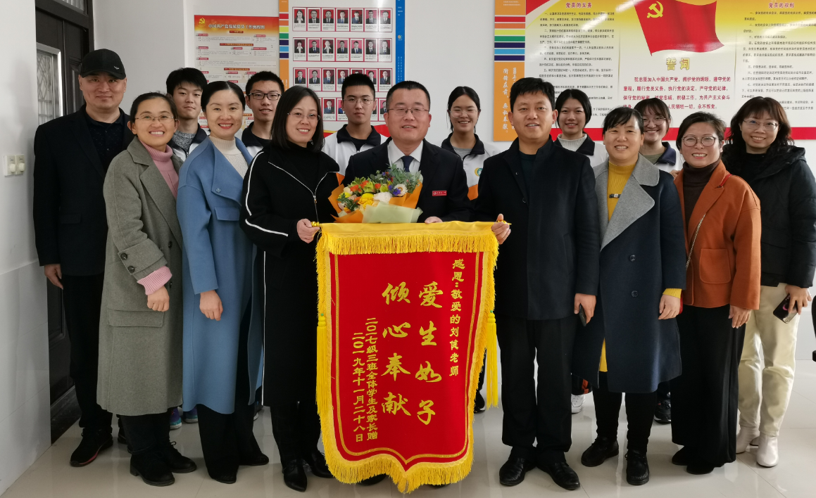 2019年10月份,刘健同志膝盖韧带撕裂,医生建议手术并修养四个月,但学生身处高三,高考在即,刘健同志心急如焚,不仅拒绝手术,而且只在家休养了不到一个月就返回了工作岗位,带病工作。学生家长了解情况后,为表达感谢感激,将代表全班学生和家长心意的锦旗送到学校、送到刘健同志手中。