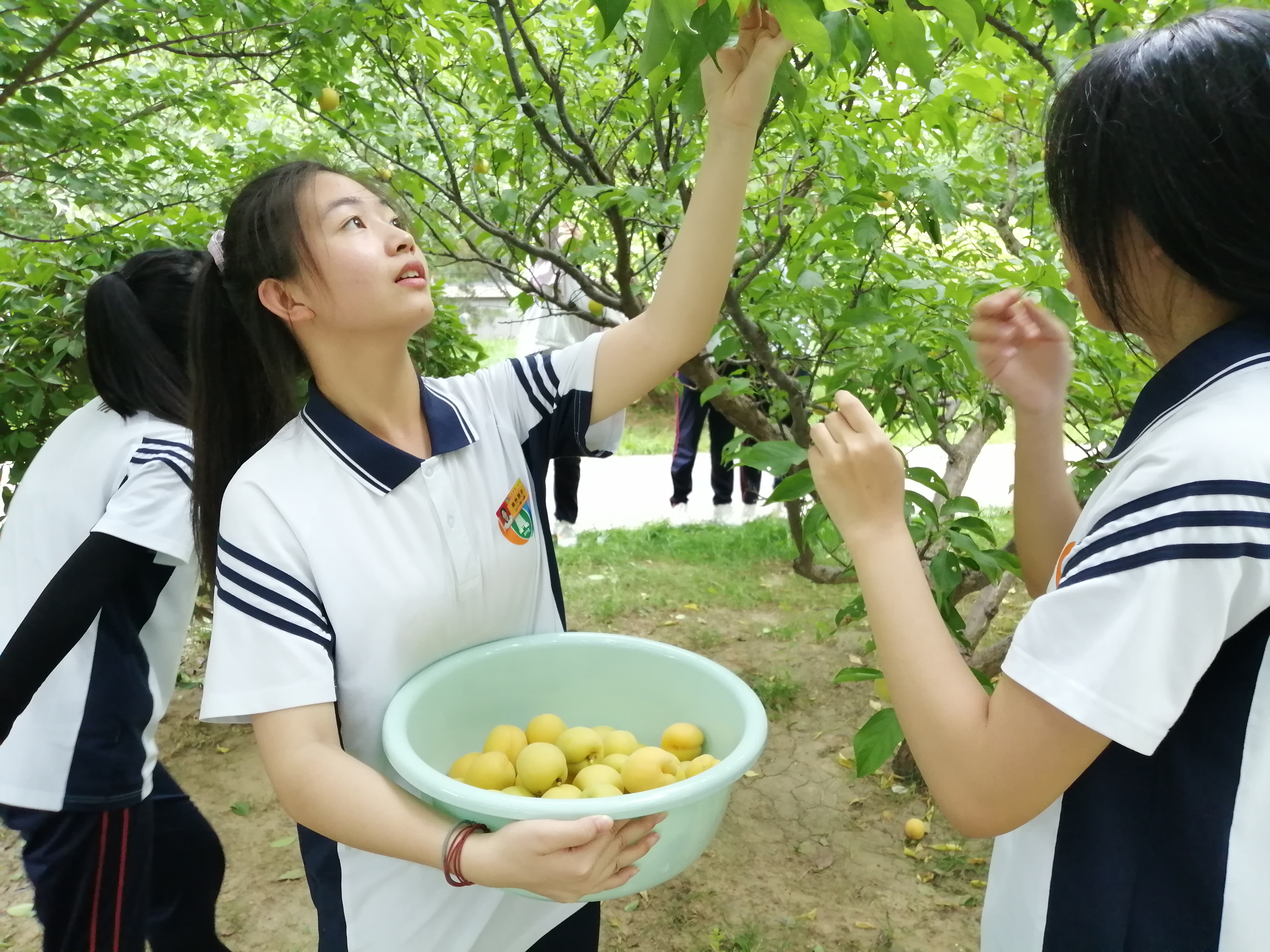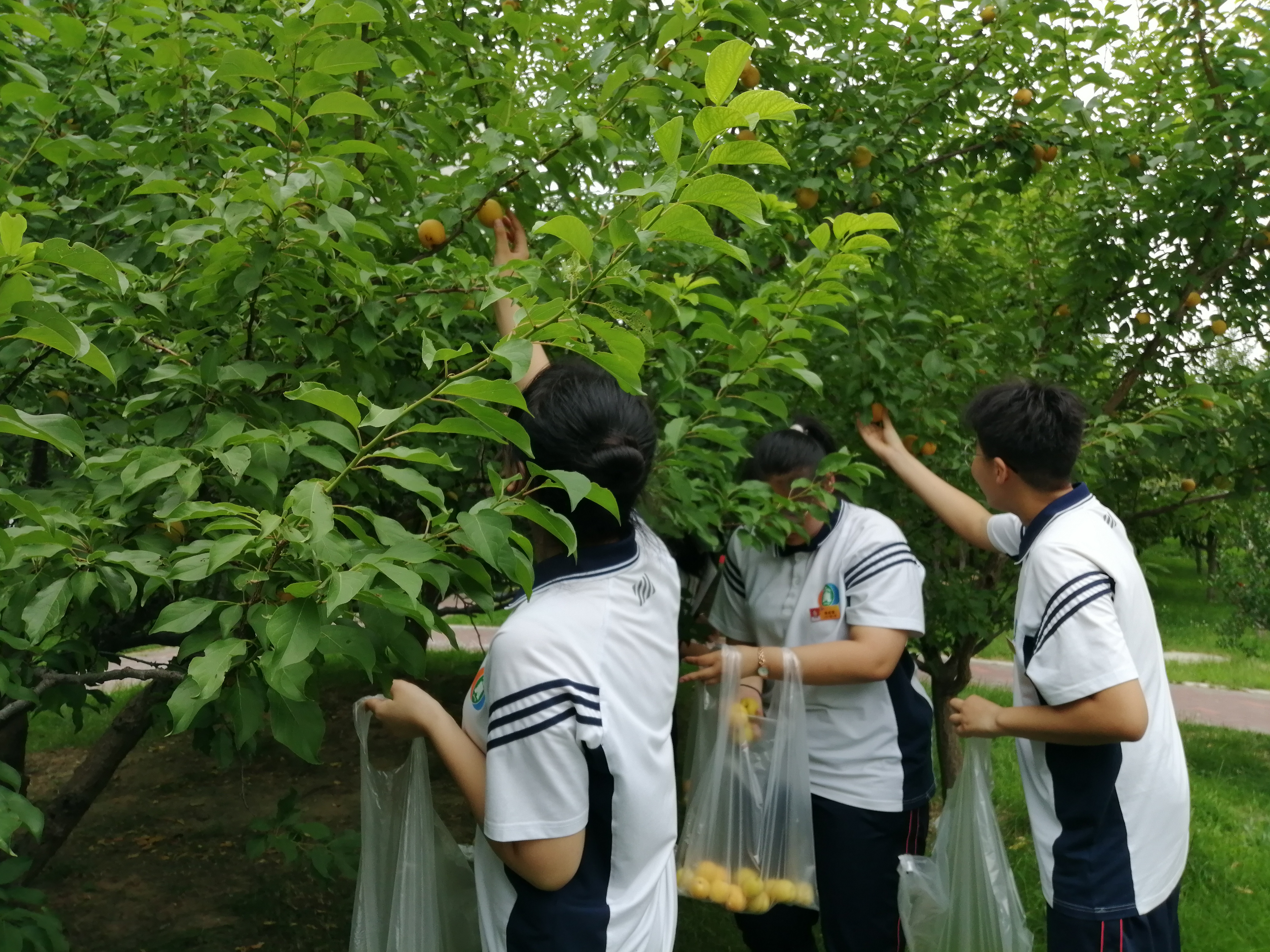 同学们兴致勃勃地穿梭在果树之间,小心翼翼地采摘熟透的金杏。他们有的踮起脚尖,摘下高悬枝头的果实;有的认真拾取地上保存尚好果实。一派忙碌与兴奋,一身汗水与微笑。