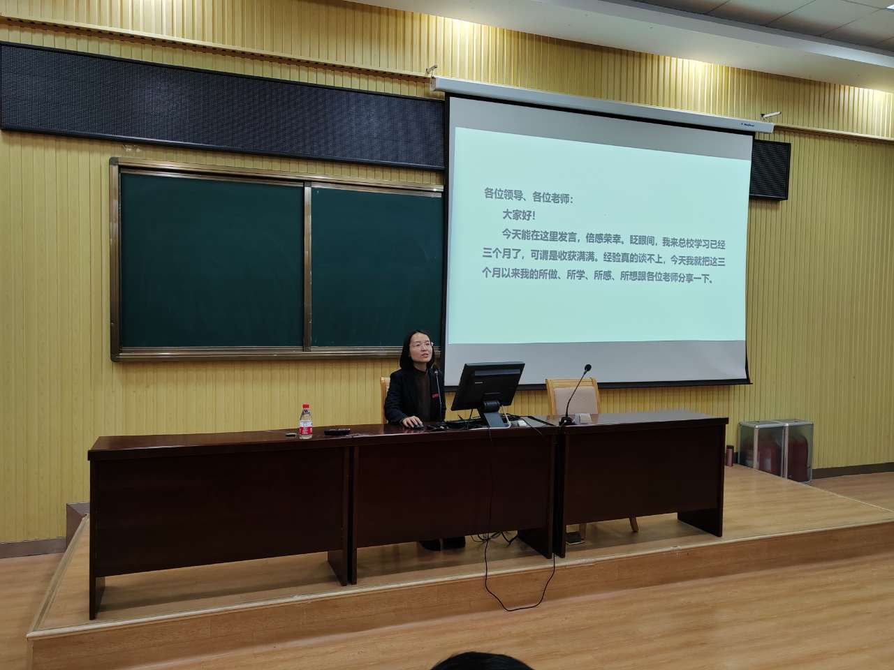 物理组吴娟老师作了《知不足而后进 望山远而力行》的报告,吴老师感叹:个人优秀成绩的取得离不开强大温暖、干劲十足的高一物理组。吴娟老师对物理组每位教师身上闪亮的优点赞叹不已,并介绍了自己从垦利一中到市一中教学交流的心路历程。吴老师迅速调整自己的状态,适应市一中紧张有序的教学节奏,感受到了团队作战的强大力量。